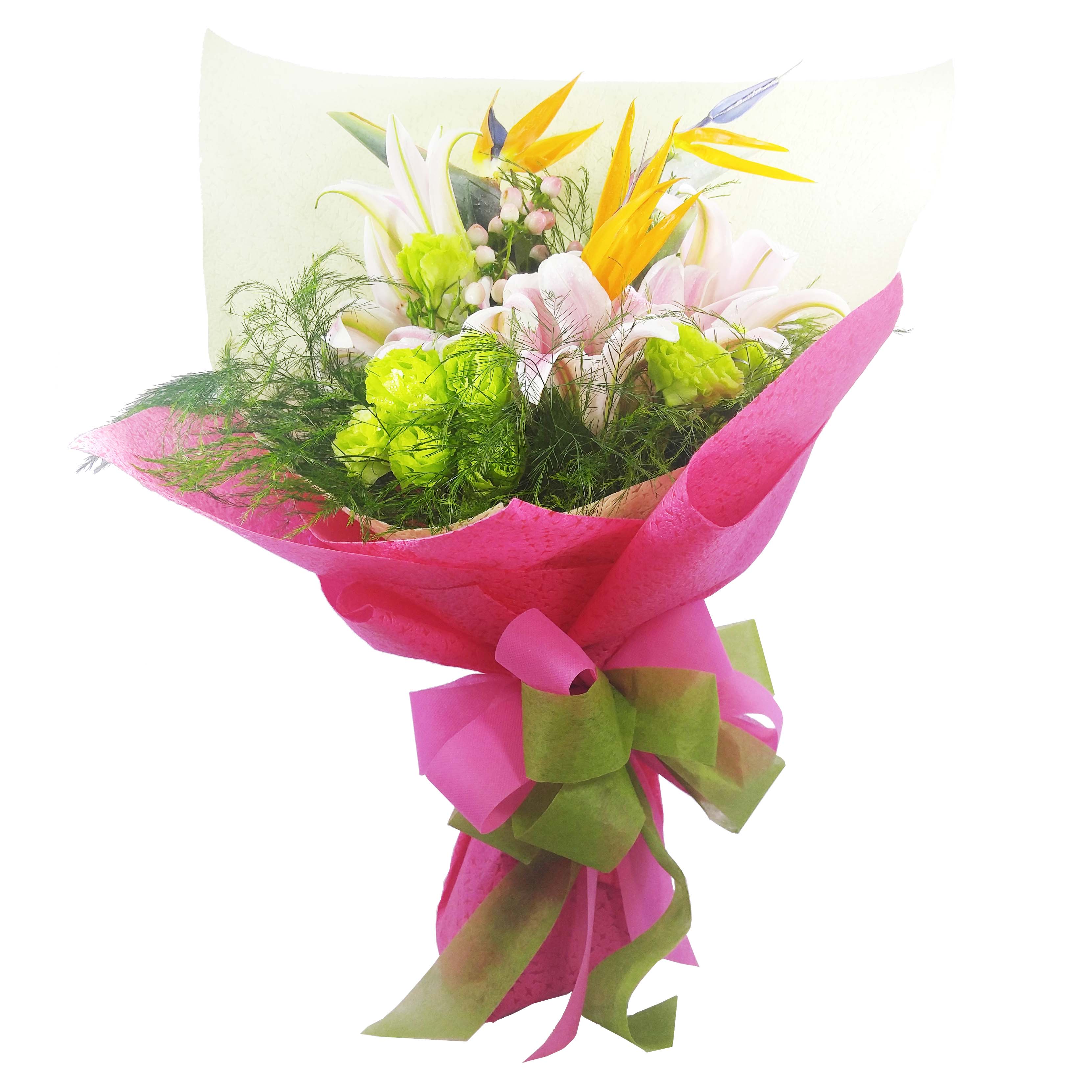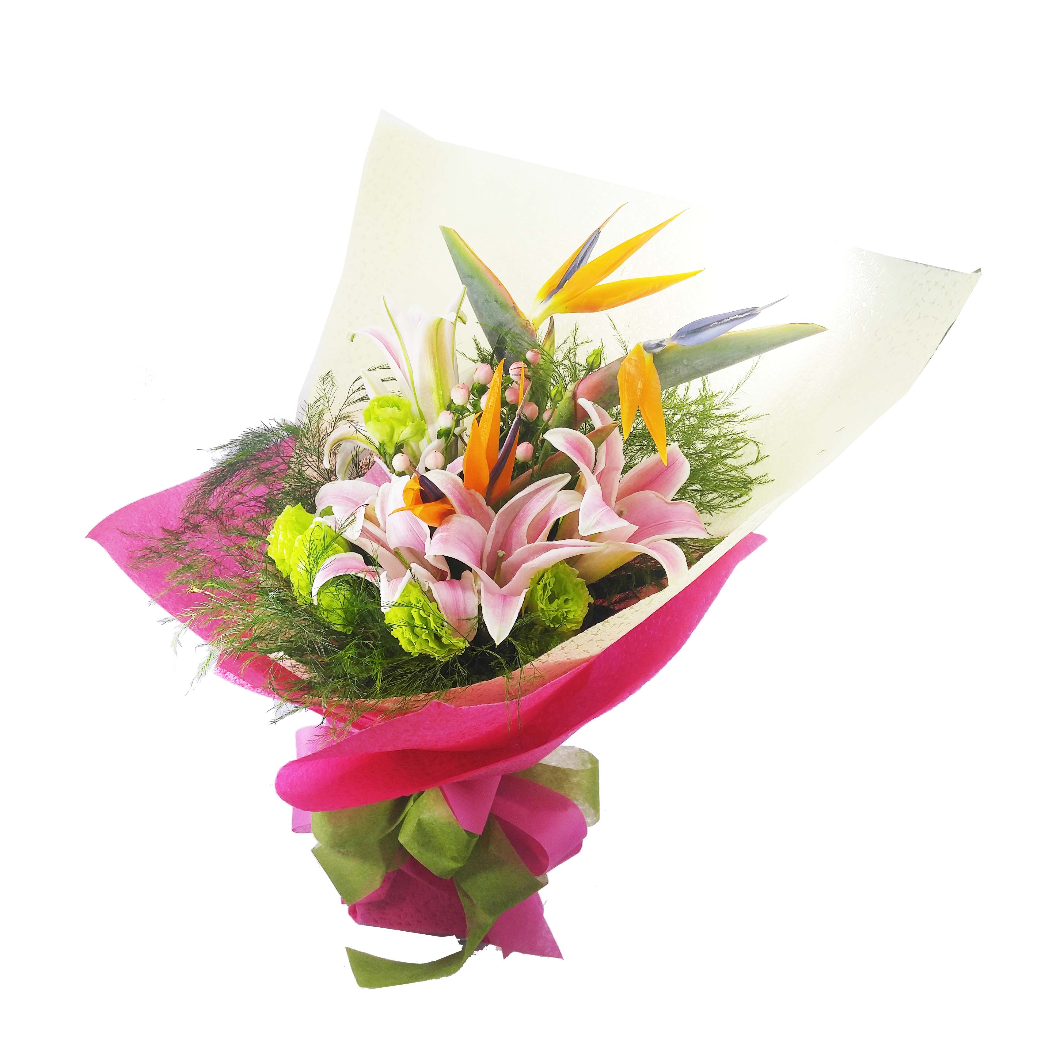 天堂鳥,香水百合,青色桔梗,粉色小紅豆,伴葉
