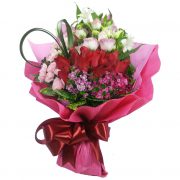 20枝紅色玫瑰+粉紅桔梗+小白合+粉紅小丁+粉美女櫻+春蘭葉+伴葉